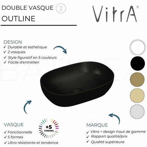 La marque VITRA vous propose en exclusivité sa double vasque avec 5 formes et 5 couleurs de disponible pour un choix varié. Votre espace lavabo sera, de plus, muni d une double vasque de haute qualité avec une résistance à toute épreuve. Le haut de gamme VITRA vous présente sa collection Outline , la double vasque la plus variées sur le marché.