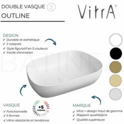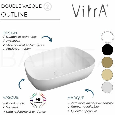 La marque VITRA vous propose en exclusivité sa double vasque avec 5 formes et 5 couleurs de disponible pour un choix varié. Votre espace lavabo sera, de plus, muni d une double vasque de haute qualité avec une résistance à toute épreuve. Le haut de gamme VITRA vous présente sa collection Outline , la double vasque la plus variées sur le marché.