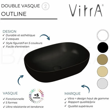 La marque VITRA vous propose en exclusivité sa double vasque avec 5 formes et 5 couleurs de disponible pour un choix varié. Votre espace lavabo sera, de plus, muni d une double vasque de haute qualité avec une résistance à toute épreuve. Le haut de gamme VITRA vous présente sa collection Outline , la double vasque la plus variées sur le marché.